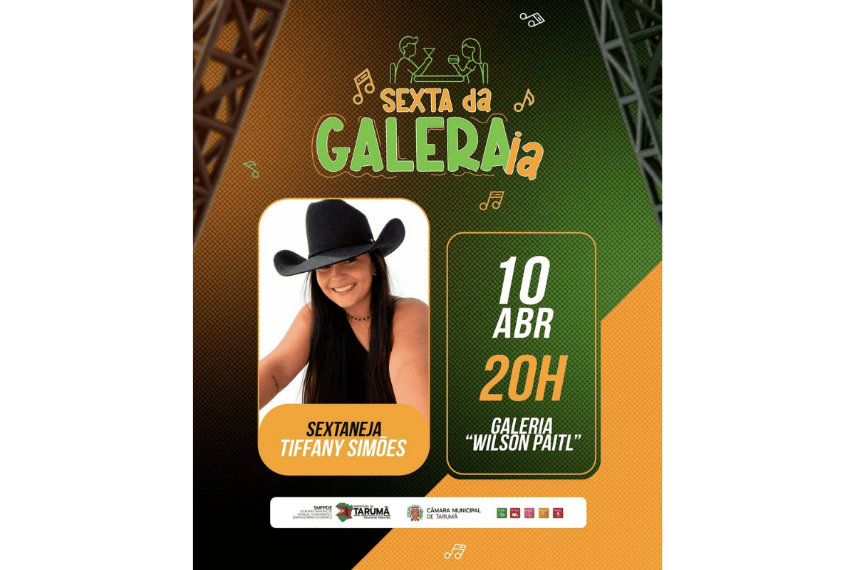 A Prefeitura de Tarumã realiza nesta sexta-feira (10), a partir das 20h, mais uma edição da “Sexta da Galera”, evento voltado ao lazer e à convivência da população. A programação acontece na Galeria “Wilson Paitl” e terá como destaque o show da cantora Tiffany Simões, que leva ao público um repertório voltado ao sertanejo.