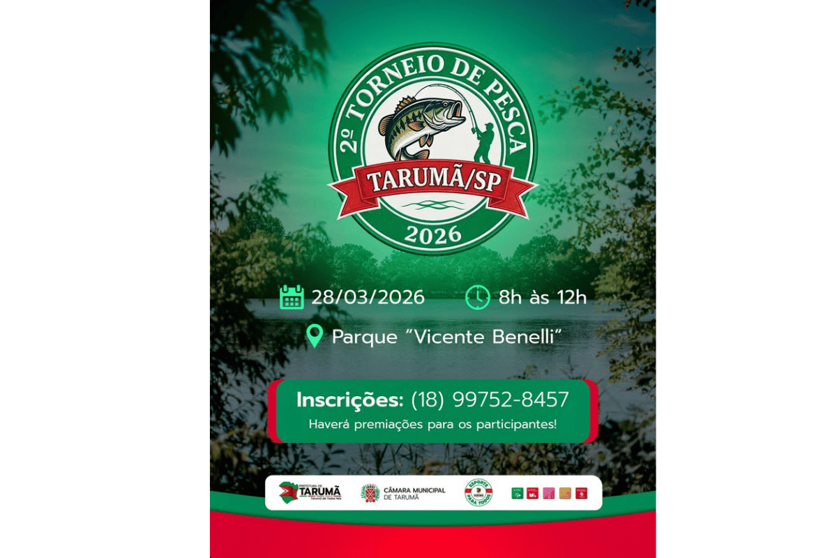 A Prefeitura de Tarumã realiza no último sábado do mês, dia 28 de março, o 2º Torneio de Pesca, evento voltado à integração da comunidade e ao incentivo ao lazer ao ar livre. A atividade acontece das 8h às 12h, no Parque Vicente Benelli.