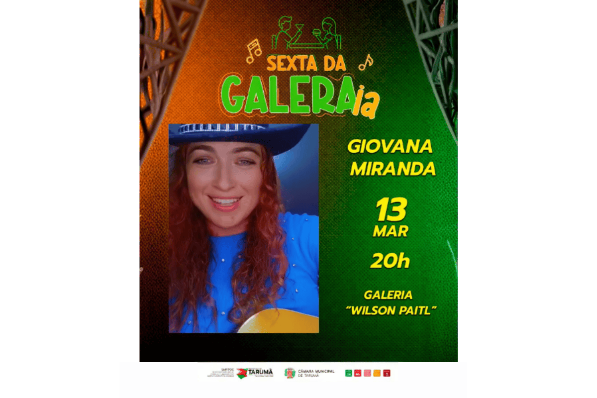 A cidade de Tarumã terá mais uma edição do evento musical Sexta da Galeria na sexta-feira, 13 de março. A programação contará com apresentação ao vivo da cantora Giovana Miranda, a partir das 20h, na Galeria Comercial “Wilson Paitl”, reunindo moradores para uma noite de música e convivência.