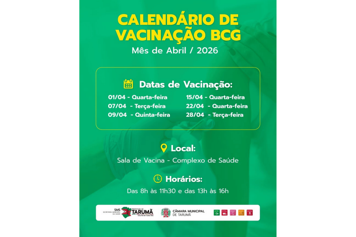 A Prefeitura de Tarumã divulgou o calendário atualizado da vacinação BCG para o mês de abril de 2026. A próxima aplicação já acontece nesta terça-feira, dia 7, após a primeira data ter sido realizada no início do mês