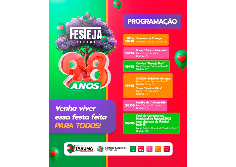 A programação segue no domingo, 19 de outubro, com a Corrida Festeja Run, às 7h, no Parque Vicente Benelli, e o evento principal de aniversário, o Festeja Tarumã 98 Anos, das 9h às 17h, no mesmo local. À noite, o público poderá curtir o show de Karina Silva, novamente na Praça da Matriz, às 21h.