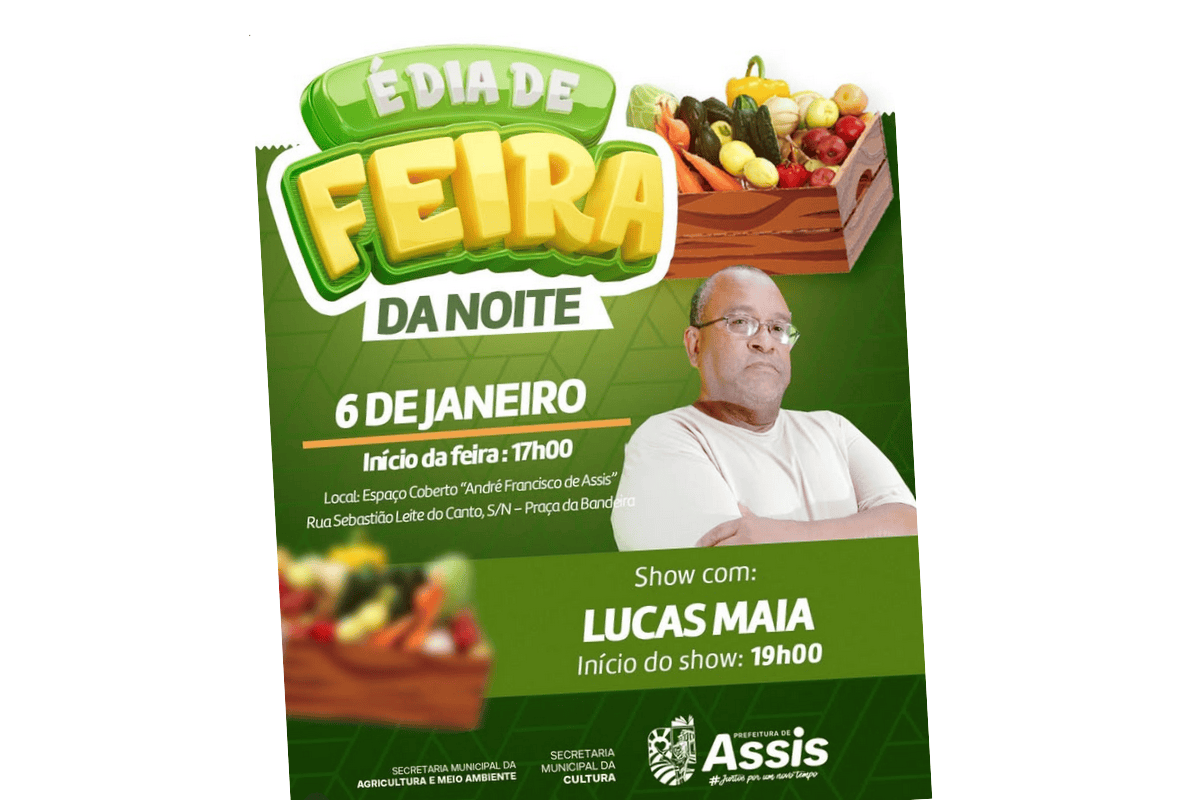 A Feira da Noite de Assis abre oficialmente a programação de 2026 nesta terça-feira, 6 de janeiro, no Espaço Coberto André Francisco de Assis, localizado na Praça da Bandeira. A feira começa a partir das 17h e reúne produtores locais, opções gastronômicas e apresentação musical ao vivo.