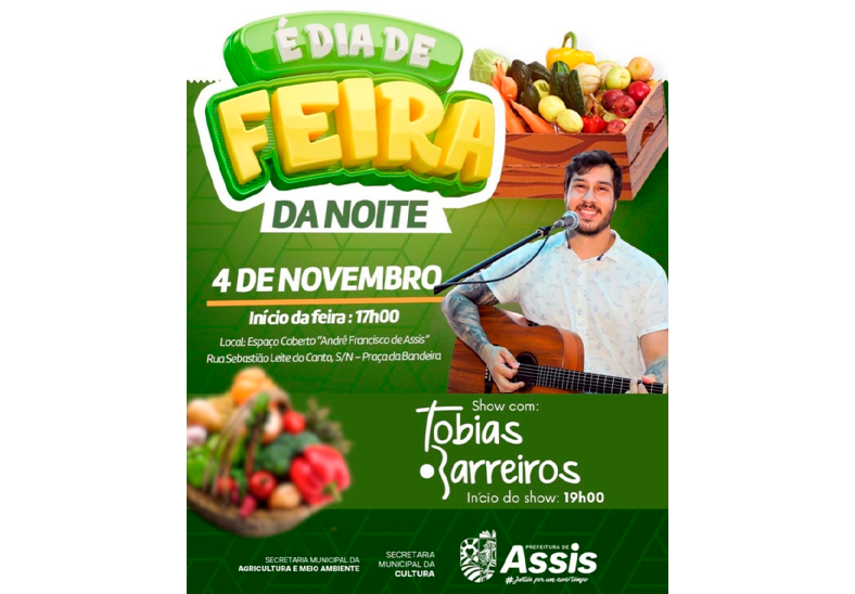 A tradicional Feira da Noite de Assis acontece nesta terça-feira, 4 de novembro, a partir das 17h, no Espaço Coberto “André Francisco de Assis”, na Praça da Bandeira. O evento reúne produtores locais e oferece um ambiente preparado com conforto, estrutura e acolhimento para toda a família.