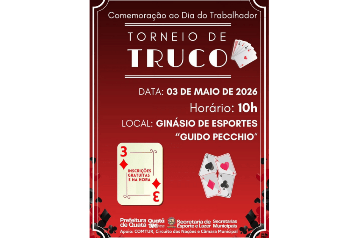 A cidade de Quatá promove, no próximo dia 3 de maio, um Torneio de Truco em comemoração ao Dia do Trabalhador. A competição será realizada a partir das 10h, no Ginásio de Esportes “Guido Pecchio”, com participação aberta ao público.