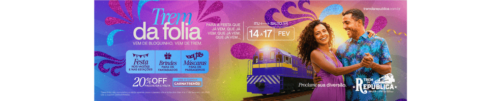 O Trem da República, que liga as cidades de Itu e Salto, no interior paulista, realiza entre os dias 14 e 17 de fevereiro a operação especial “Trem da Folia”, com programação temática de Carnaval e desconto promocional para o período. A proposta é oferecer uma alternativa turística que une passeio ferroviário histórico, festas nas estações e acesso às programações municipais das duas cidades.