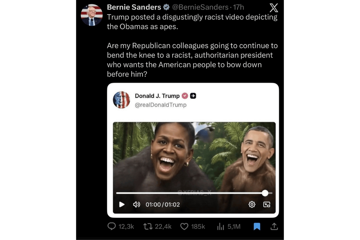 A publicação provocou reação imediata de lideranças políticas norte-americanas. O senador Bernie Sanders classificou o vídeo como “nojento” e afirmou, em tradução livre, que Trump divulgou um conteúdo “abertamente racista”, questionando se líderes republicanos continuarão a se submeter a um presidente que promove ódio e autoritarismo.