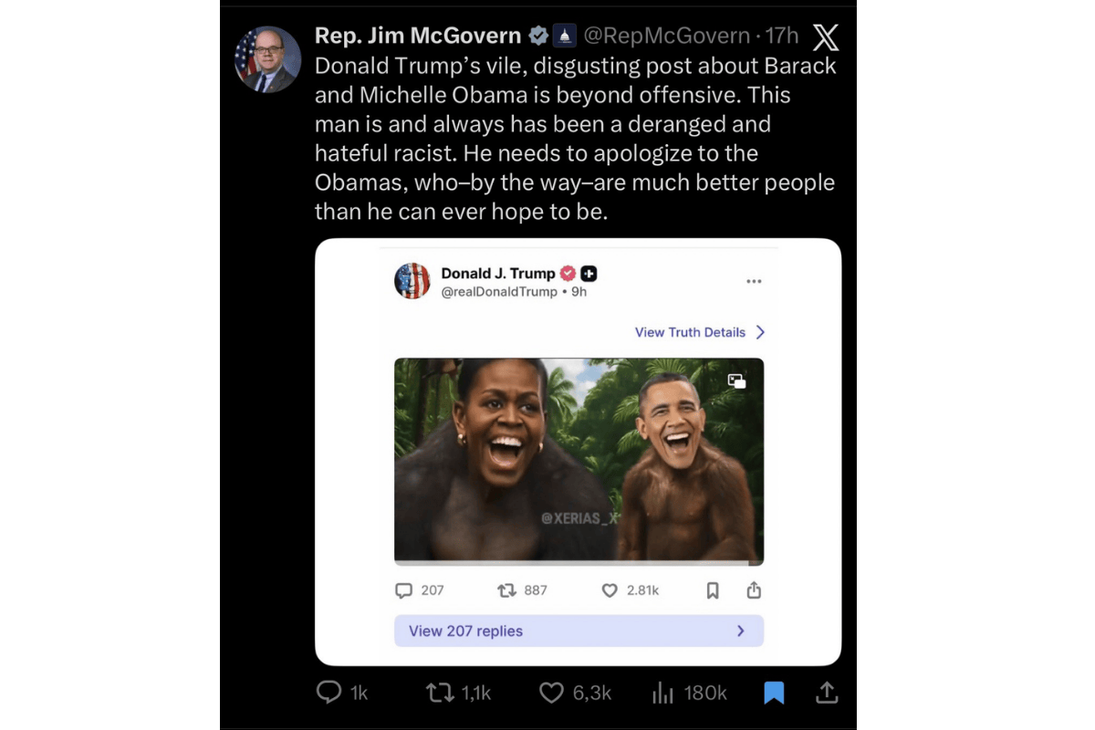 O deputado Jim McGovern foi ainda mais direto. Em manifestação pública, afirmou que a publicação é “vil, repugnante e profundamente ofensiva”, descrevendo Trump como alguém que sempre demonstrou comportamento racista e intolerante. Em tradução livre, disse que o presidente deveria se desculpar com os Obama, ressaltando que eles representam valores humanos e democráticos que Trump jamais demonstrou.