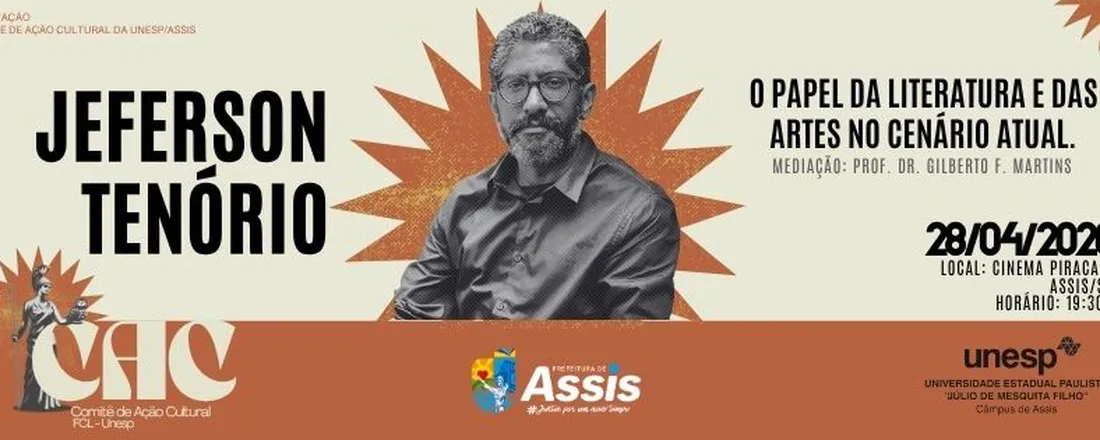 A Unesp de Assis promove, no dia 28 de abril, um encontro com o escritor Jeferson Tenório para discutir o papel da literatura e das artes no cenário contemporâneo. O evento será realizado no Cinema Piracaia, às 19h30, com mediação do professor doutor Gilberto F. Martins.