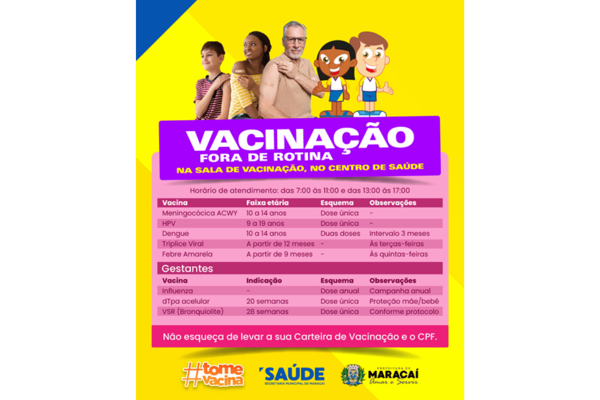 A Prefeitura de Maracaí disponibiliza vacinas fora de rotina para crianças, adolescentes, adultos e gestantes no Centro de Saúde do município. A ação amplia o acesso à imunização e reforça a importância de manter a caderneta atualizada, conforme a faixa etária e a indicação clínica de cada vacina.