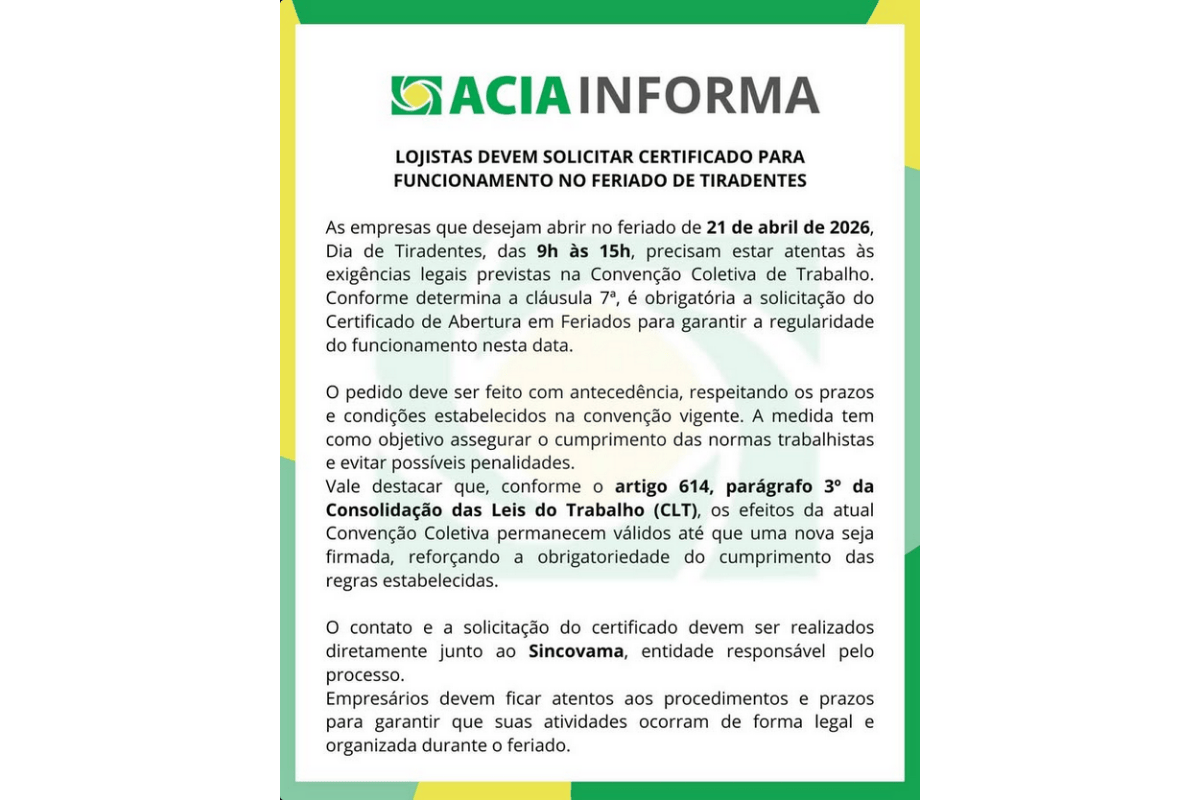 A Associação Comercial e Industrial de Assis (ACIA) emitiu um alerta aos lojistas do município sobre as regras para funcionamento no feriado de Tiradentes, celebrado em 21 de abril. De acordo com a entidade, as empresas que desejarem abrir devem seguir exigências legais previstas na Convenção Coletiva de Trabalho, incluindo a obrigatoriedade de solicitar o Certificado de Abertura em Feriados.