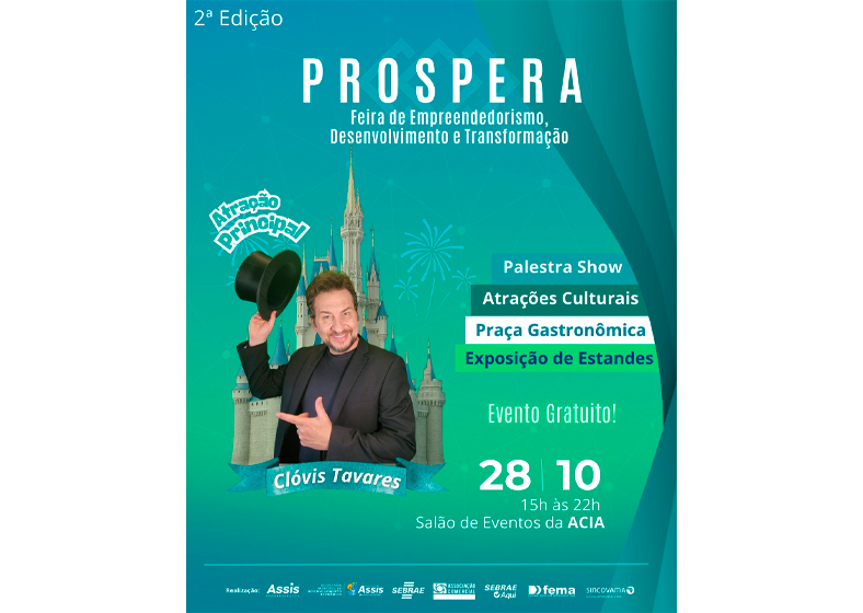 A segunda edição da PROSPERA – Feira de Empreendedorismo, Desenvolvimento e Transformação acontece nesta terça-feira, 28 de outubro, das 15h às 22h, no Salão de Eventos da ACIA (Associação Comercial e Industrial de Assis). O evento é gratuito e promete uma tarde e noite de inspiração, negócios, cultura e encantamento, reunindo expositores, artistas e empreendedores locais em uma grande celebração da criatividade e do desenvolvimento regional.