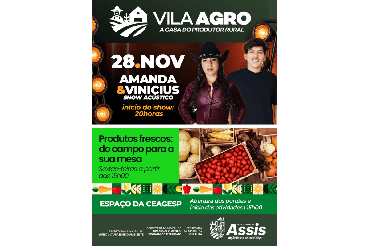 Promovida pela Prefeitura de Assis, por meio das Secretarias de Agricultura e Meio Ambiente, Desenvolvimento Econômico e Turismo e Cultura, a Vila Agro se consolida como um ponto de encontro semanal, que celebra o campo, os sabores locais e a convivência em um ambiente aberto à população.