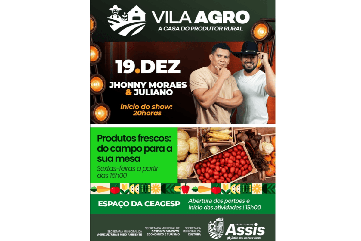 A Vila Agro desta sexta-feira, 19 de dezembro, movimenta Assis com mais uma edição voltada à valorização do produtor rural, da gastronomia artesanal e da cultura local. O evento ocorre no Espaço da Ceagesp, com abertura dos portões e início das atividades a partir das 15h, reunindo feira de produtos frescos e programação cultural para toda a família.