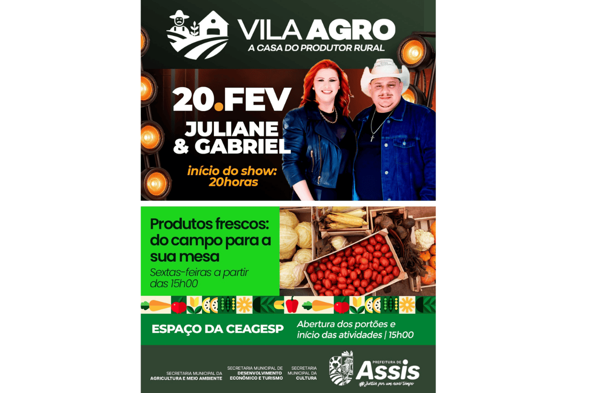 A Prefeitura de Assis realiza nesta sexta-feira, 20 de fevereiro de 2026, mais uma edição da Vila Agro, iniciativa que reúne produtores locais, gastronomia artesanal e atrações culturais em um espaço voltado à convivência familiar. O evento começa às 15h, com show ao vivo a partir das 20h.