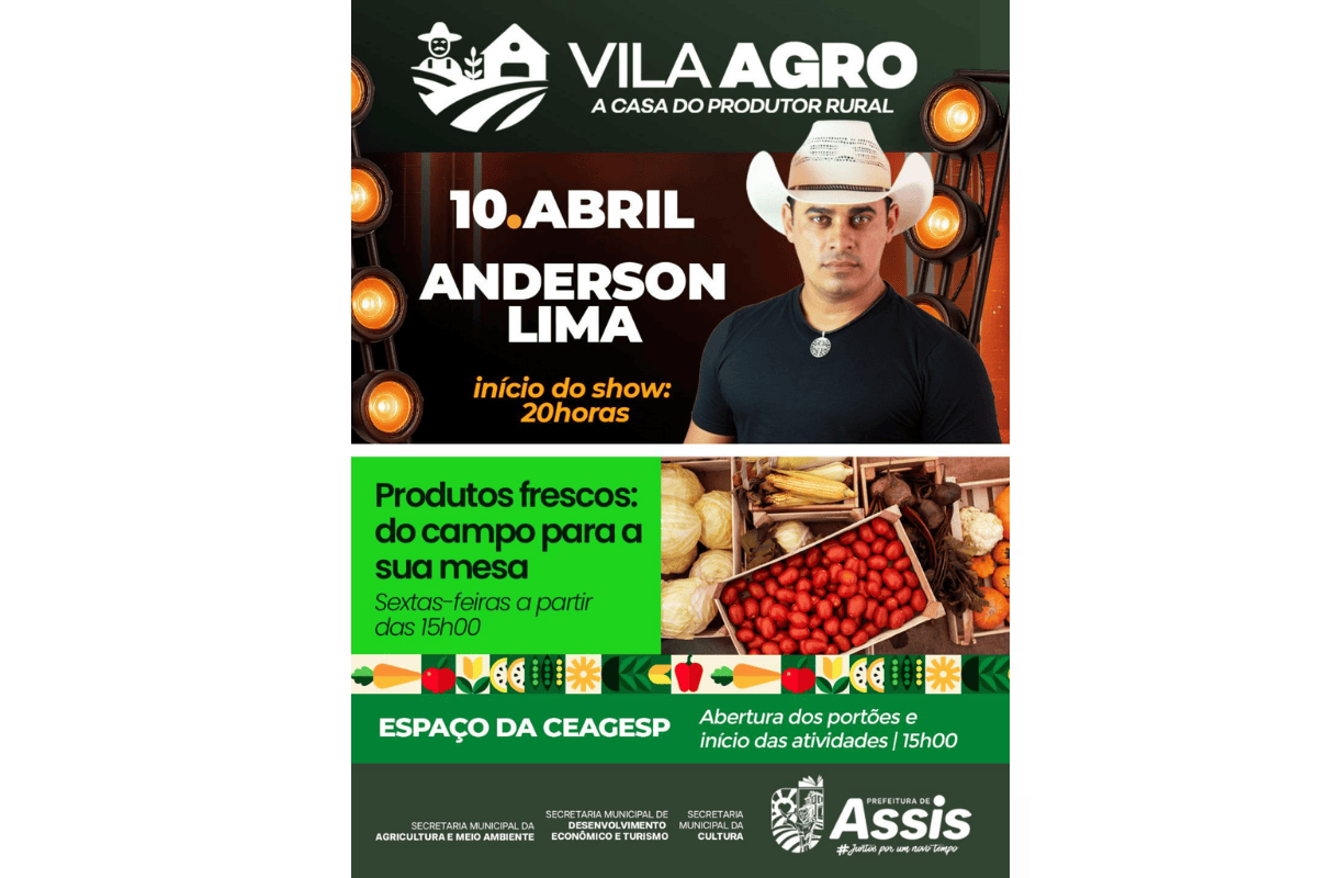 A Vila Agro será realizada nesta sexta-feira, 10 de abril, em Assis, reunindo produtores rurais, gastronomia e música ao vivo no Espaço da Ceagesp. A programação começa às 15h, com abertura dos portões e início das atividades, e segue ao longo da noite com show do cantor Anderson Lima, previsto para as 20h.