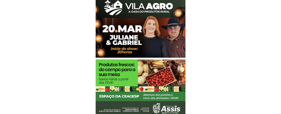 Assis recebe nesta sexta-feira (20) mais uma edição da Vila Agro, evento que valoriza produtores rurais, o comércio local e promove uma programação voltada à convivência e cultura.