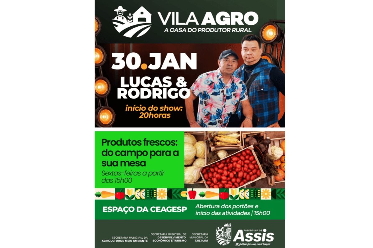 A Vila Agro realiza mais uma edição nesta sexta-feira, dia 30 de janeiro de 2026, em Assis, com programação que combina feira de produtores, gastronomia artesanal, lazer e show ao vivo da dupla Lucas e Rodrigo. O evento acontece no Espaço da Ceagesp, com abertura dos portões às 15h e início do show às 20h.