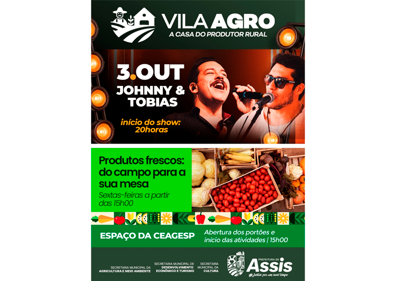 A Prefeitura de Assis promove nesta sexta-feira, 3 de outubro, mais uma edição da Vila Agro, espaço que valoriza o produtor rural e oferece ao público uma tarde de lazer, cultura e gastronomia. O evento será realizado no espaço da Ceagesp, com abertura dos portões a partir das 15h.