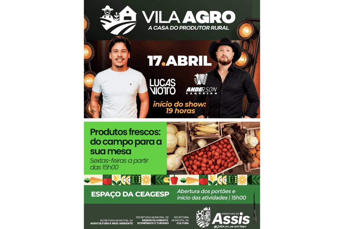 A Vila Agro acontece na sexta-feira (17), em Assis, reunindo feira de produtores, gastronomia e programação cultural no Espaço da Ceagesp. O evento tem abertura dos portões às 15h, com início das atividades no mesmo horário, e show ao vivo a partir das 19h com Lucas Vioto e Anderson Vaqueiro.
