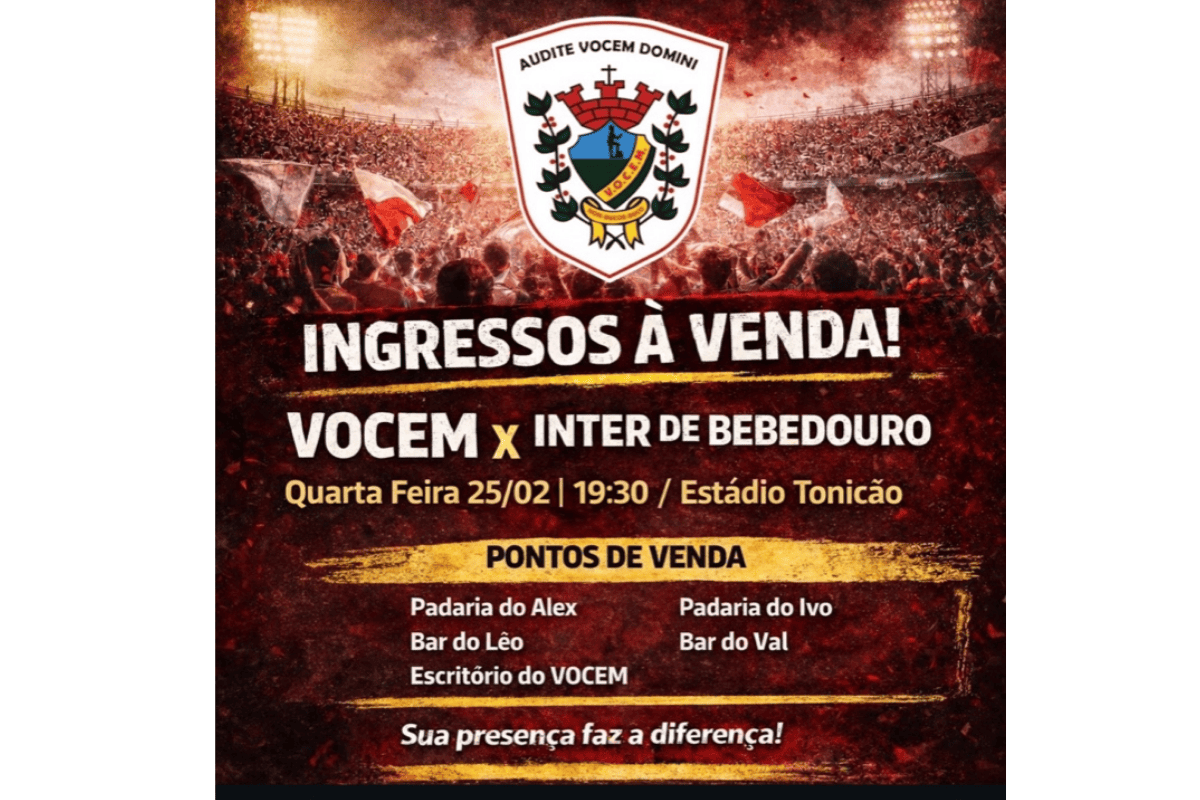 O Vocem enfrenta o Inter de Bebedouro nesta quarta-feira, 25 de fevereiro, às 19h30, no Estádio Municipal Antônio Viana da Silva, o Tonicão, em Assis, pela 6ª rodada do Campeonato Paulista A4. Os ingressos já estão disponíveis em pontos físicos da cidade, com valores diferenciados para compra antecipada.