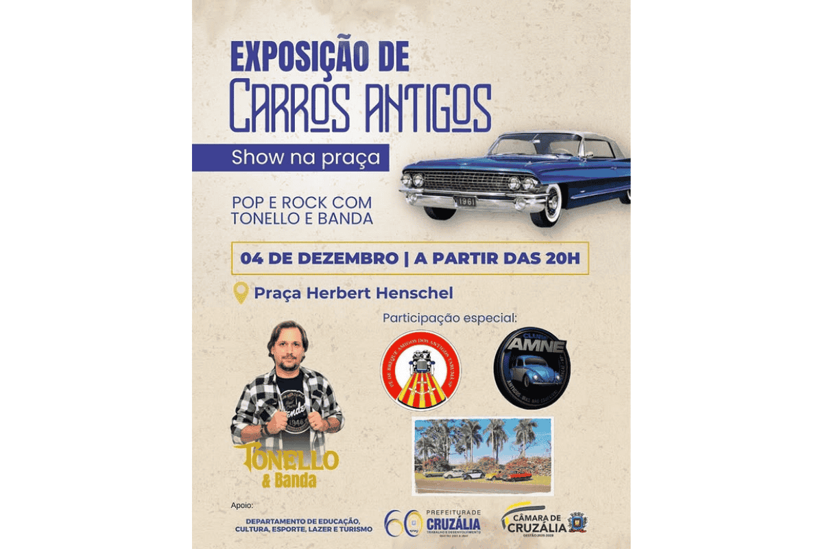 A Praça Herbert Henschel recebe nesta quinta-feira, 4 de dezembro, a partir das 20h, a Exposição de Carros Antigos, um encontro aberto ao público que destaca veículos clássicos, modelos preservados por colecionadores e apaixonados pela história automotiva. A programação inclui ainda apresentação musical de Tonello & Banda, com repertório de pop e rock para animar a noite.