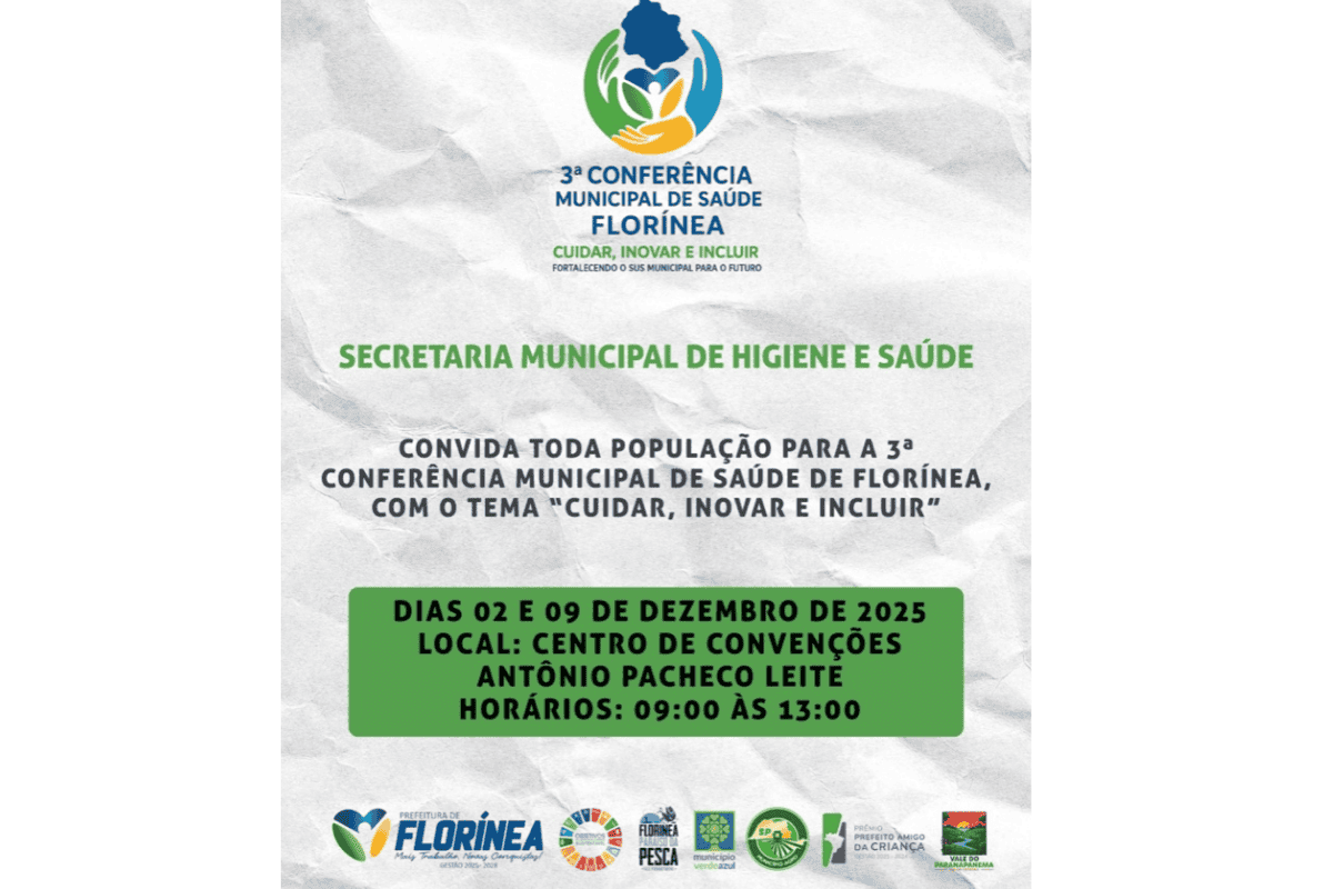 A Secretaria Municipal de Higiene e Saúde de Florínea realizará nos dias 2 e 9 de dezembro, ambos terça-feira, a 3ª Conferência Municipal de Saúde. Os encontros acontecem das 9h às 13h, no Centro de Convenções Antônio Pacheco Leite, com participação aberta à comunidade.