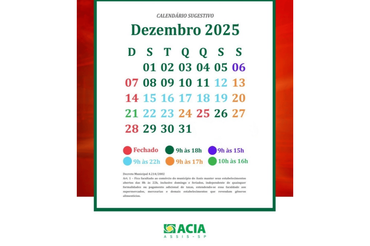 A Associação Comercial e Industrial de Assis apresentou o calendário sugestivo de funcionamento do comércio para dezembro de 2025, com início dos horários diferenciados a partir do dia 12, em diversos pontos da cidade. A proposta define como as lojas podem operar durante o período, incluindo dias com abertura estendida e exceções para facilitar as compras de fim de ano.