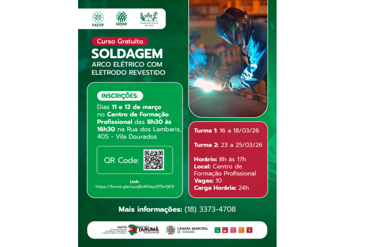 A Prefeitura de Tarumã abre inscrições para um curso gratuito de Soldagem a Arco Elétrico com Eletrodo Revestido, voltado a quem deseja se qualificar para atuar no setor industrial. A capacitação é realizada em parceria com o FAESP/SENAR e o Sindicato Rural de Assis, com foco na formação prática de profissionais para o mercado de trabalho.