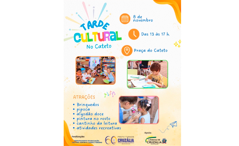 A Prefeitura de Cruzália realiza neste sábado, 8 de novembro, mais uma edição da Tarde Cultural, desta vez no bairro do Cateto, com uma programação especial voltada ao lazer, à cultura e à convivência comunitária. O evento acontece das 13h às 17h, na Praça do Cateto, com entrada gratuita.