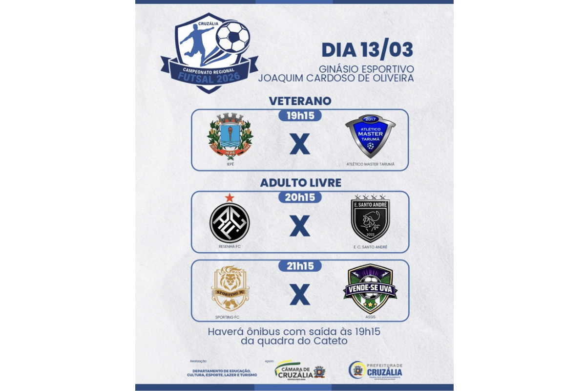 O Campeonato Regional de Futsal 2026 terá mais uma rodada nesta sexta-feira, dia 13 de março, em Cruzália. As partidas serão disputadas no Ginásio Esportivo Joaquim Cardoso de Oliveira, reunindo equipes da região em confrontos nas categorias veterano e adulto livre.