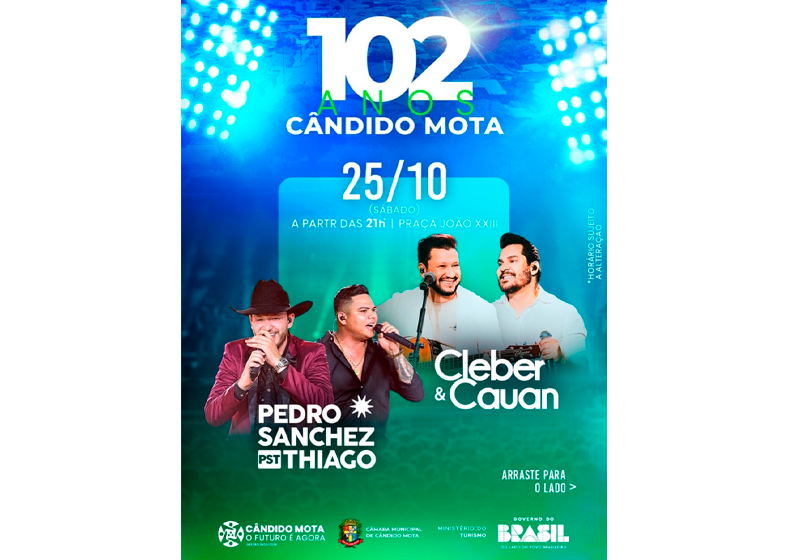 As comemorações pelos 102 anos de Cândido Mota continuam neste sábado, 25 de outubro, com uma noite dedicada ao sertanejo na Praça João XXIII. O público poderá acompanhar dois grandes shows gratuitos, com Cleber & Cauan e Pedro Sanchez & Thiago, a partir das 21h.