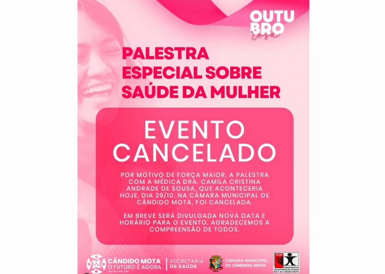 Como parte das ações do Outubro Rosa, a Secretaria de Saúde de Cândido Mota, em parceria com a Câmara Municipal e a Associação de Voluntários do Câncer “Bia Franciscatti”, realiza nesta quarta-feira, dia 29 de outubro, às 19h, uma palestra especial sobre a saúde da mulher. O encontro será na Câmara Municipal de Cândido Mota e é aberto ao público.