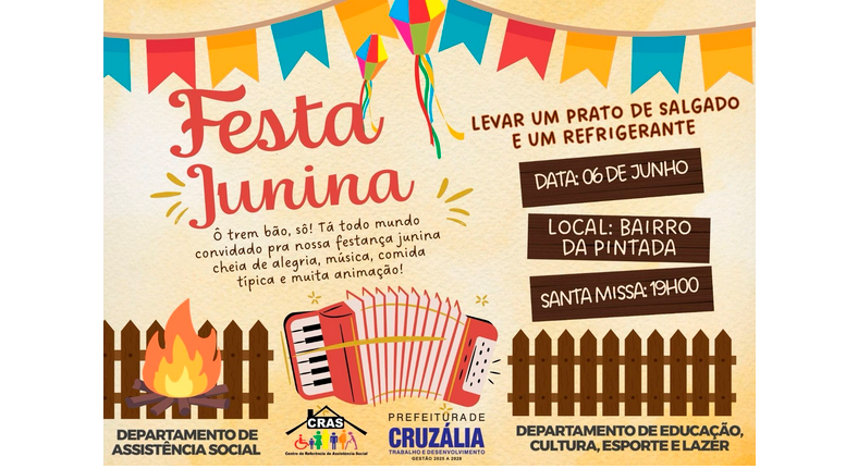 Nesta sexta-feira, 6 de junho, a comunidade do Bairro da Pintada, em Cruzália, realiza sua tradicional Festa Junina Comunitária, promovida pelo Departamento de Educação, Cultura, Esporte e Lazer, com apoio do Departamento de Assistência Social e do CRAS. A programação tem início às 19h, com Santa Missa, seguida de muita animação, comidas típicas, música e integração entre os moradores.