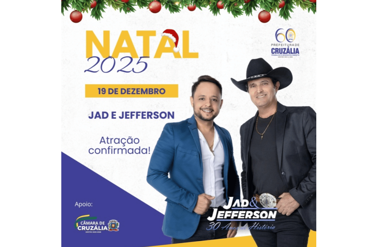 A Prefeitura Municipal de Cruzália confirmou a dupla Jad & Jefferson como atração das festividades natalinas de 2025. O show será realizado no dia 19 de dezembro, na Praça Herbert Henschel, em evento aberto ao público.