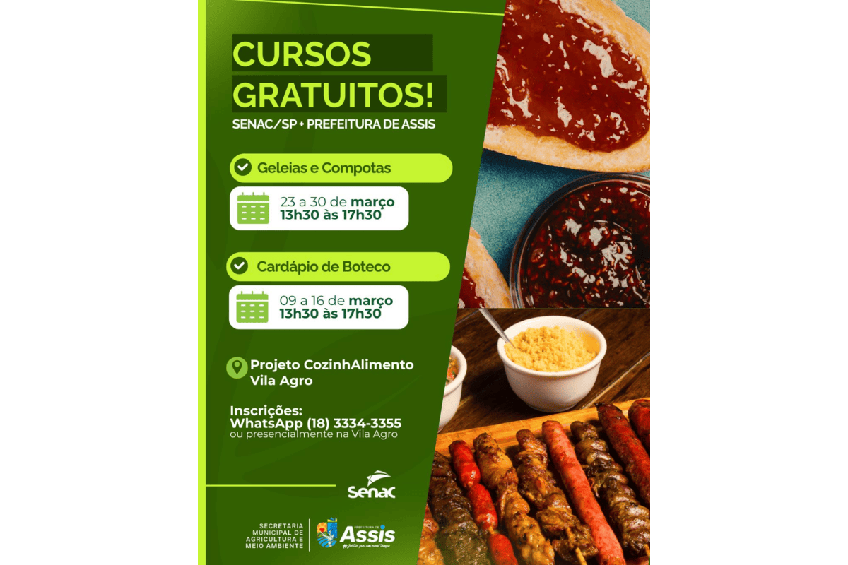 A Prefeitura de Assis, em parceria com o Senac/SP, está com inscrições abertas para dois cursos gratuitos na área de gastronomia. As formações serão realizadas na Vila Agro, dentro do Projeto CozinhAlimento, com certificação ao final das atividades.