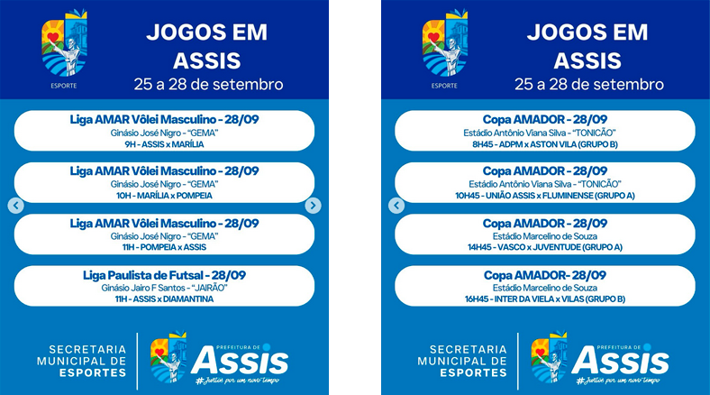 No Ginásio José Nigro, o Gema, a partir das 9h, a Liga AMAR de Vôlei Masculino abre a rodada com Assis enfrentando Marília. Às 10h, Marília encara Pompeia, e às 11h, Pompeia mede forças com Assis, encerrando a sequência de partidas. No mesmo horário, às 11h, o Ginásio Jairo F. Santos, o Jairão, será palco da Liga Paulista de Futsal, em que Assis enfrenta Diamantina.