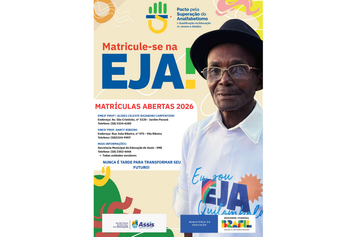 A Prefeitura de Assis abriu as matrículas para a Educação de Jovens e Adultos (EJA) do ano letivo de 2026, por meio da Secretaria Municipal da Educação, com vagas destinadas a pessoas que não concluíram a educação básica na idade regular e buscam retomar a trajetória escolar. As inscrições já estão disponíveis no município, com atendimento direto nas unidades que ofertam a modalidade e apoio em todas as escolas municipais.