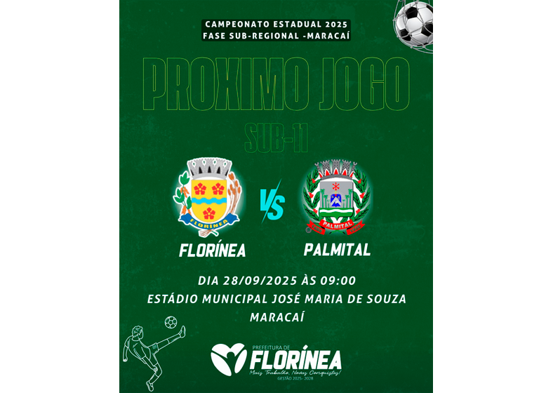 A equipe Sub-11 de Florínea entra em campo neste domingo (28) para mais um desafio pelo Campeonato Estadual 2025, fase sub-regional. O confronto será contra a equipe de Palmital, às 9h, no Estádio Municipal José Maria de Souza, em Maracaí.