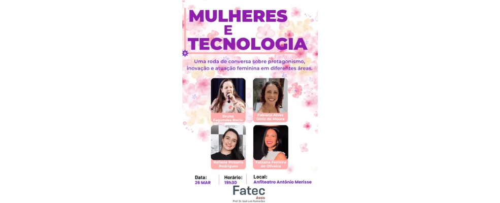 A Fatec Assis realiza, nesta quarta-feira, 26 de março, o evento “Mulheres e Tecnologia”, com início às 19h30, no Anfiteatro Antônio Merisse. A proposta é promover uma roda de conversa sobre protagonismo feminino, inovação e atuação em diferentes áreas do setor.