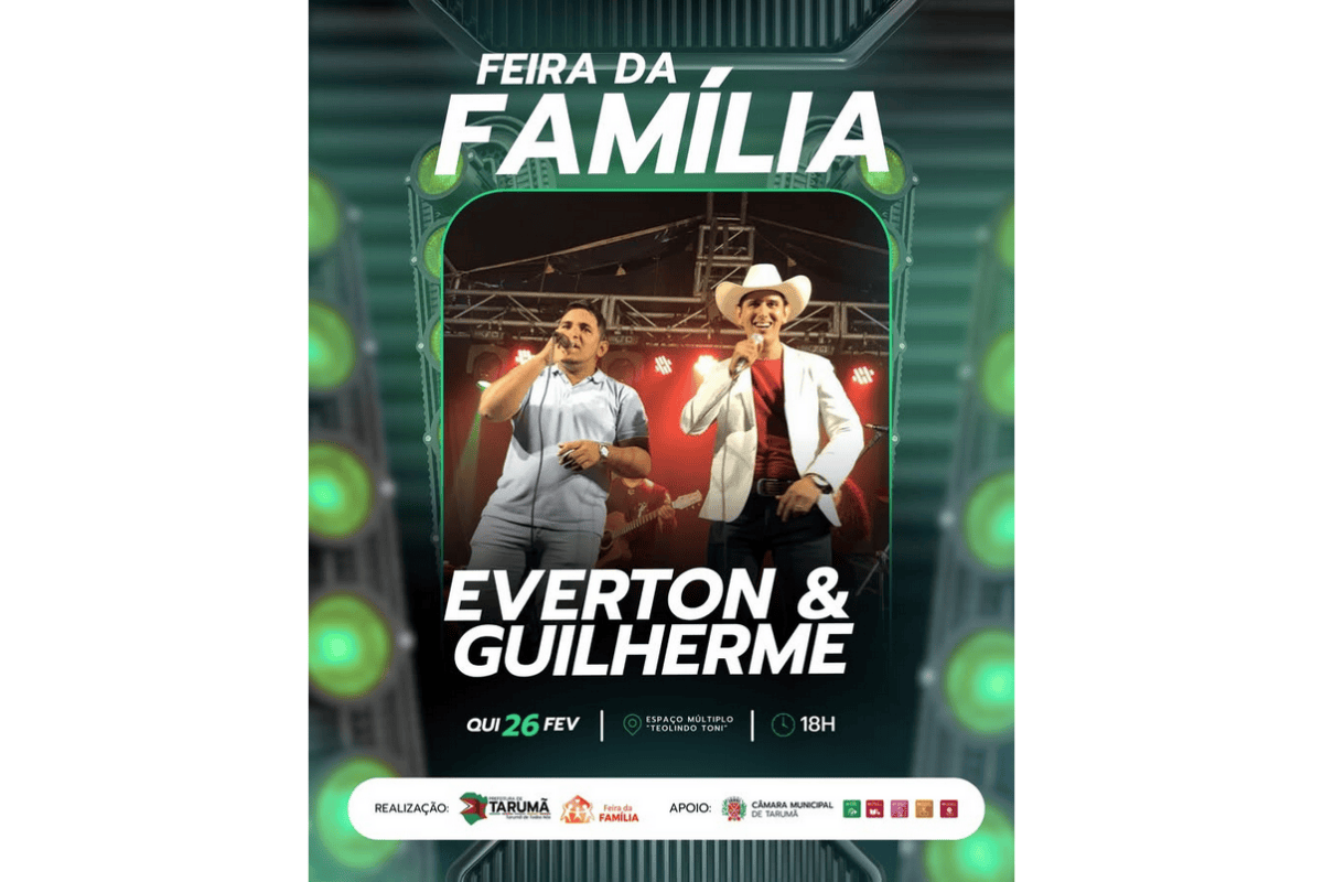 A Feira da Família realiza mais uma edição nesta quinta-feira, 26 de fevereiro, a partir das 18h, no Espaço Múltiplo Teolindo Toni, em Tarumã. O destaque da noite é o show da dupla Everton & Guilherme, que sobe ao palco para animar o público com repertório sertanejo.