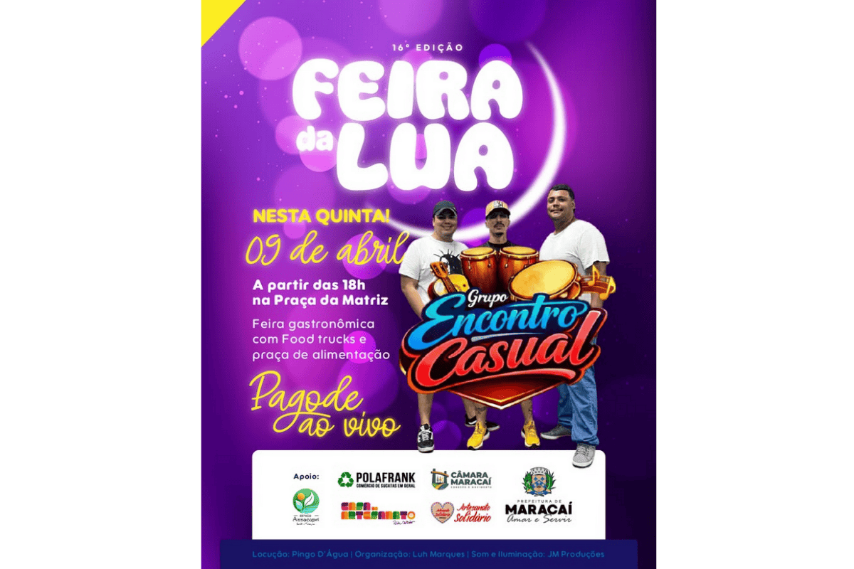 A cidade de Maracaí recebe, nesta quinta-feira, 09 de abril, mais uma edição da tradicional Feira da Lua, que chega à sua 16ª realização com foco em música ao vivo, gastronomia e convivência. O evento acontece a partir das 18h, na Praça da Matriz.