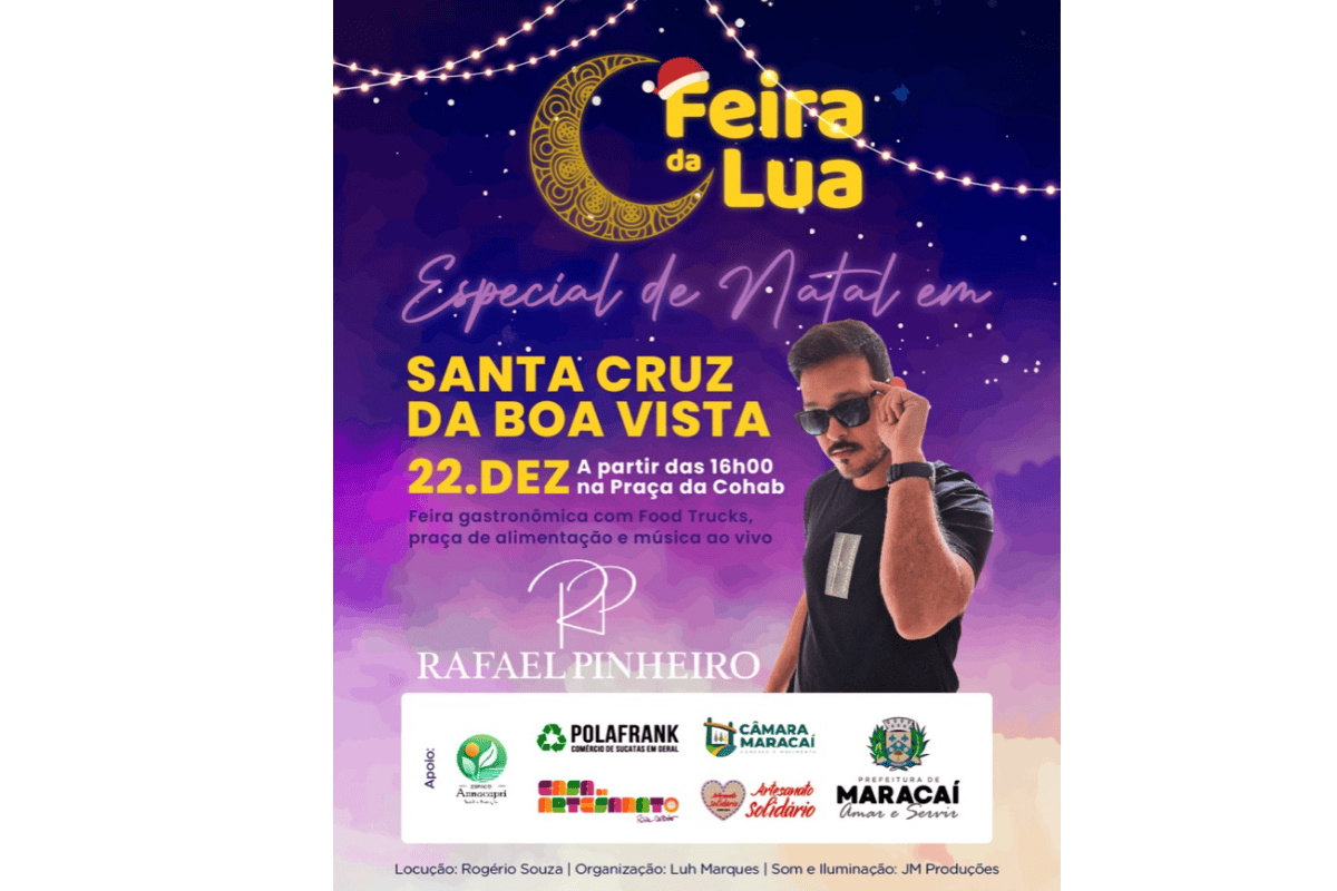A Feira da Lua Especial de Natal será realizada nesta segunda-feira, dia 22 de dezembro, em Santa Cruz da Boa Vista, a partir das 16h, na Praça da Cohab. A programação reúne feira gastronômica, praça de alimentação, food trucks e música ao vivo, com entrada gratuita para o público.