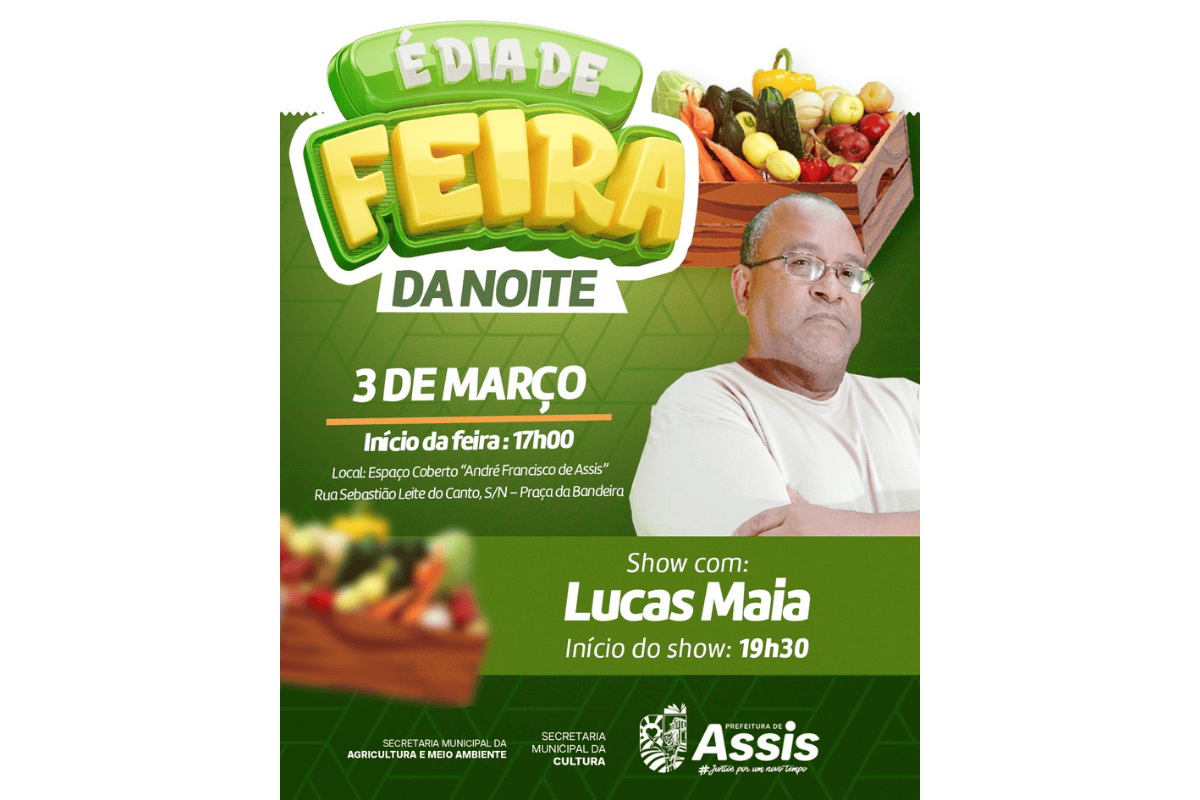 A tradicional Feira da Noite será realizada nesta terça-feira, 3 de março, a partir das 17h, no Espaço Coberto André Francisco de Assis, na Praça da Bandeira, em Assis. A iniciativa reúne produtores locais e oferece ao público hortaliças, frutas, legumes e outros itens comercializados diretamente pelos feirantes.