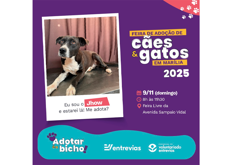 Neste domingo, 9 de novembro, a Entrevias Concessionária de Rodovias realiza mais uma edição da Feira de Adoção de Animais do programa Adotar é o Bicho, em Marília, das 8h às 11h30, durante a Feira Livre da Avenida Sampaio Vidal.