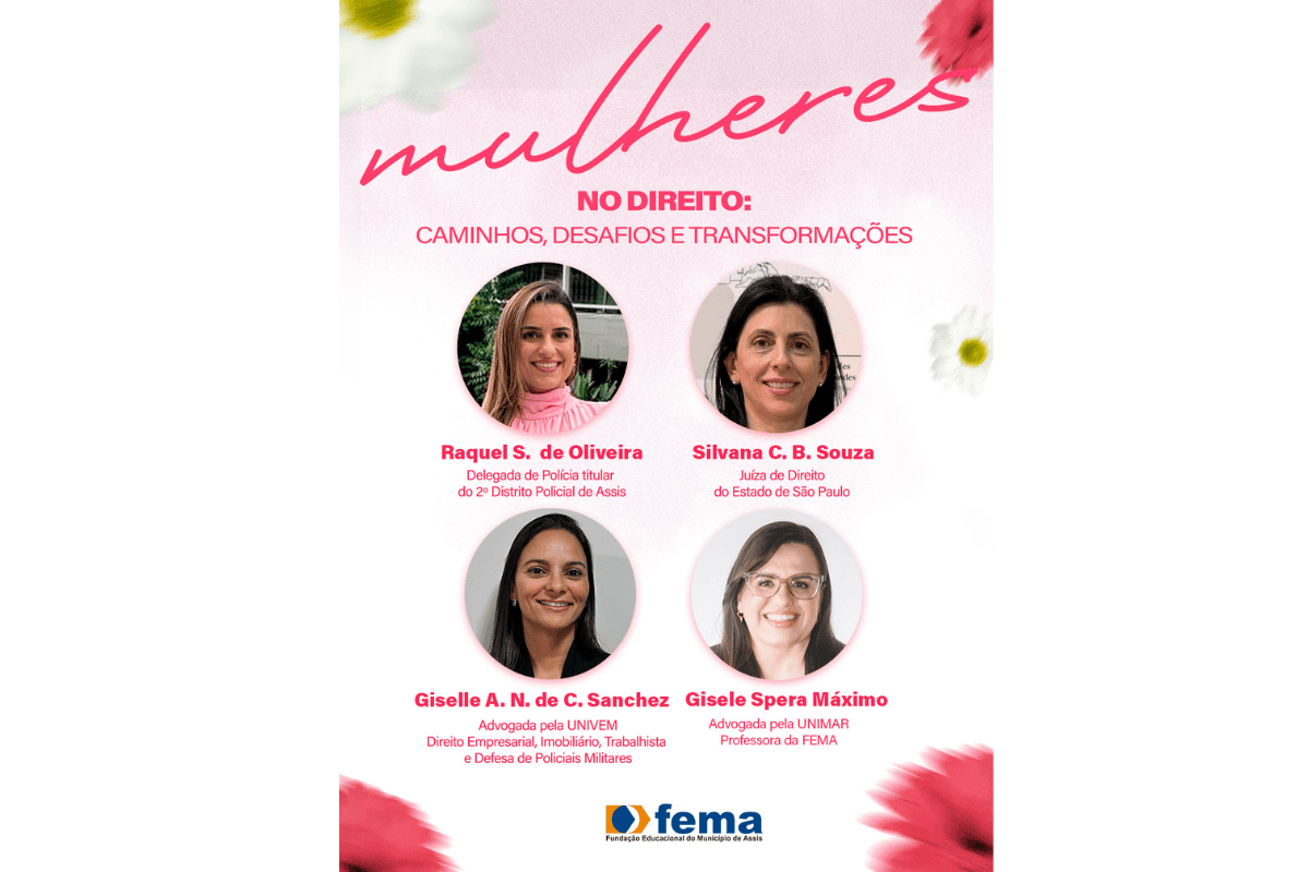A Fundação Educacional do Município de Assis (FEMA) promove nesta sexta-feira, 13 de março, às 19h30, a mesa-redonda “Mulheres no Direito: Caminhos, desafios e transformações”. O evento será realizado no Anfiteatro da instituição, no Bloco B, e reunirá profissionais com atuação em diferentes áreas do campo jurídico para compartilhar experiências e discutir a presença feminina na profissão.