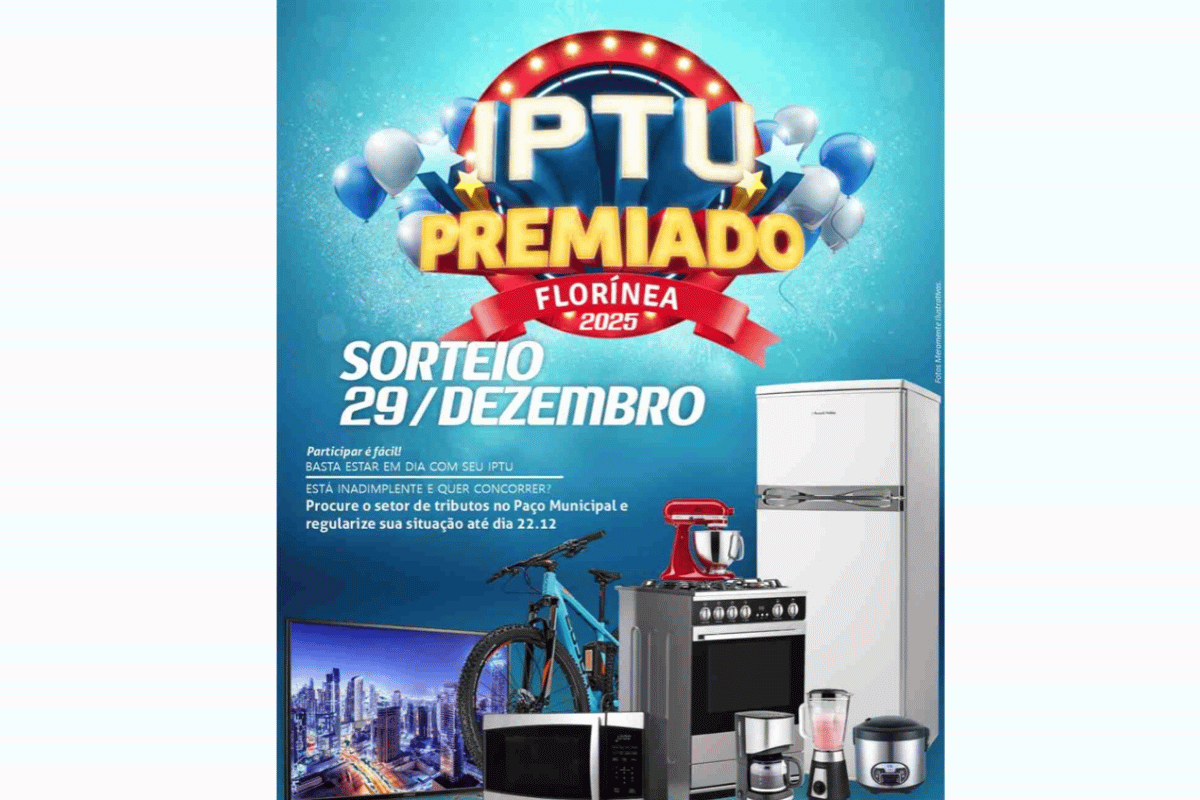 A Prefeitura de Florínea anunciou que o sorteio do programa IPTU Premiado 2025 será realizado no dia 29 de dezembro, na Praça da Matriz. A ação tem como objetivo reconhecer os contribuintes que mantêm o imposto em dia e incentivar a regularização de moradores que ainda não quitaram o débito.