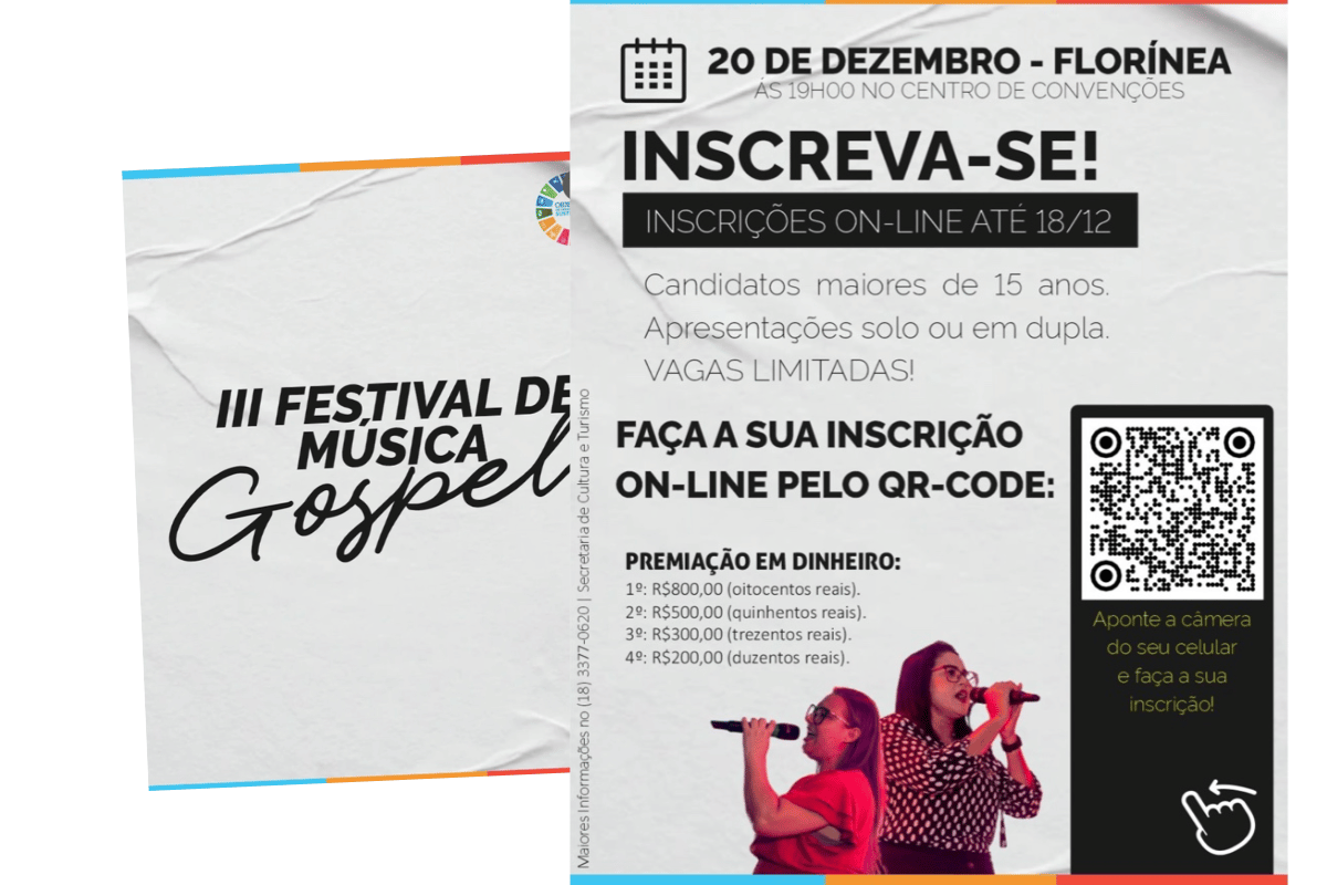 A Prefeitura de Florínea abriu as inscrições para o 3º Festival de Música Gospel, que acontece no dia 20 de dezembro, a partir das 19h, no Centro de Convenções do município. O evento é voltado a cantores solo ou em dupla, com idade mínima de 15 anos, e oferece premiação em dinheiro aos quatro primeiros colocados.