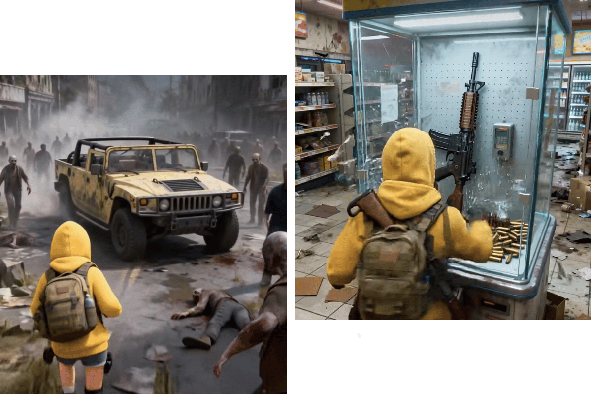 Um anúncio patrocinado de jogo mobile identificado pela equipe do Âncora 1 nas redes sociais traz uma combinação que chama atenção: personagem com aparência juvenil em estilo cartoon inserido em ambiente de violência explícita, com zumbis, armas de fogo e fuga em cenário pós-apocalíptico.