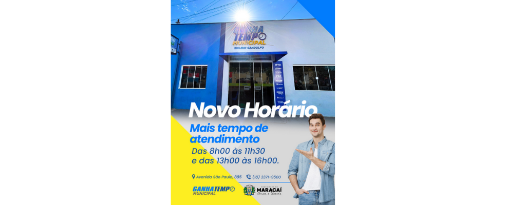 O Ganha Tempo Municipal de Maracaí informou um novo horário de atendimento ao público. A unidade, localizada na Avenida São Paulo, 885, passa a funcionar das 8h às 11h30 e das 13h às 16h.