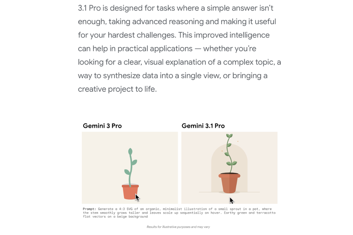 Segundo a Google, o 3.1 Pro foi projetado para tarefas em que respostas simples não são suficientes, priorizando raciocínio estruturado e síntese de informações complexas. Entre os exemplos apresentados está a geração de animações em SVG prontas para uso em websites a partir de comandos em texto.
